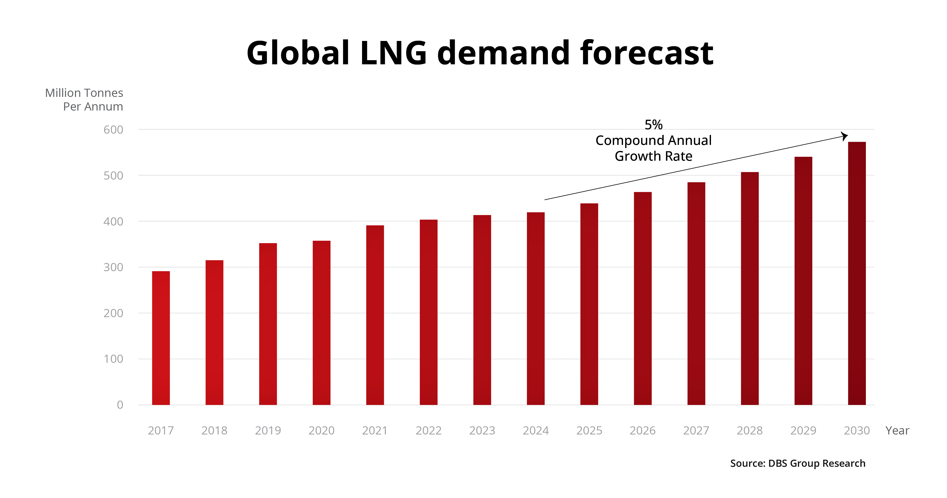 Over the last two decades, LNG has retained top spot among the world’s fastest growing fossil fuel. According to DBS Group Research, this growth in demand is expected to continue at around 5 per cent per year in the near term, with no signs of demand plateauing in the foreseeable future.