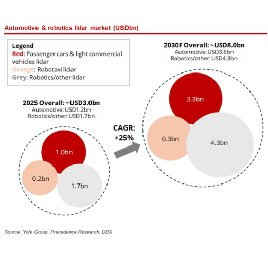 “LiDAR is entering its next growth phase, driven by robotaxi demand and the early mainstreaming of autonomy. Beyond mobility, robotics is emerging as a key incremental growth vector, with other applications such as agriculture providing longer-term upside. Chinese suppliers are at the forefront, combining rapid innovation with execution at scale,” said Karthik Kannan, Head of Global Automotive Industry, Institutional Banking Group, DBS Bank.