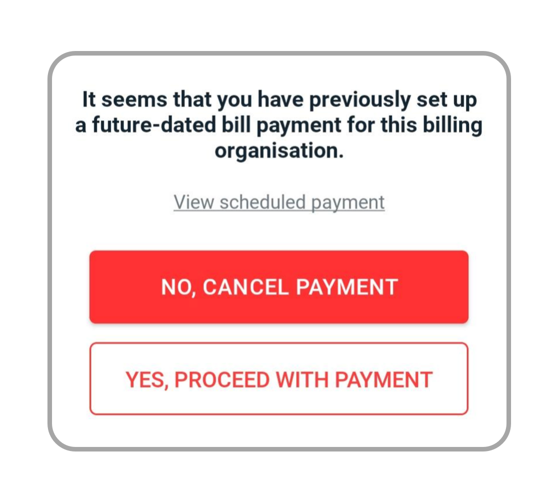 - Schedule Payments in Advance: You can schedule bill payments up to 30 days in advance. Funds will be deducted one working day before the scheduled payment date. Please ensure you have sufficient funds in your account on the deduction date. For scheduled payments to credit card billing organisations, the minimum payment amount is is SGD5.