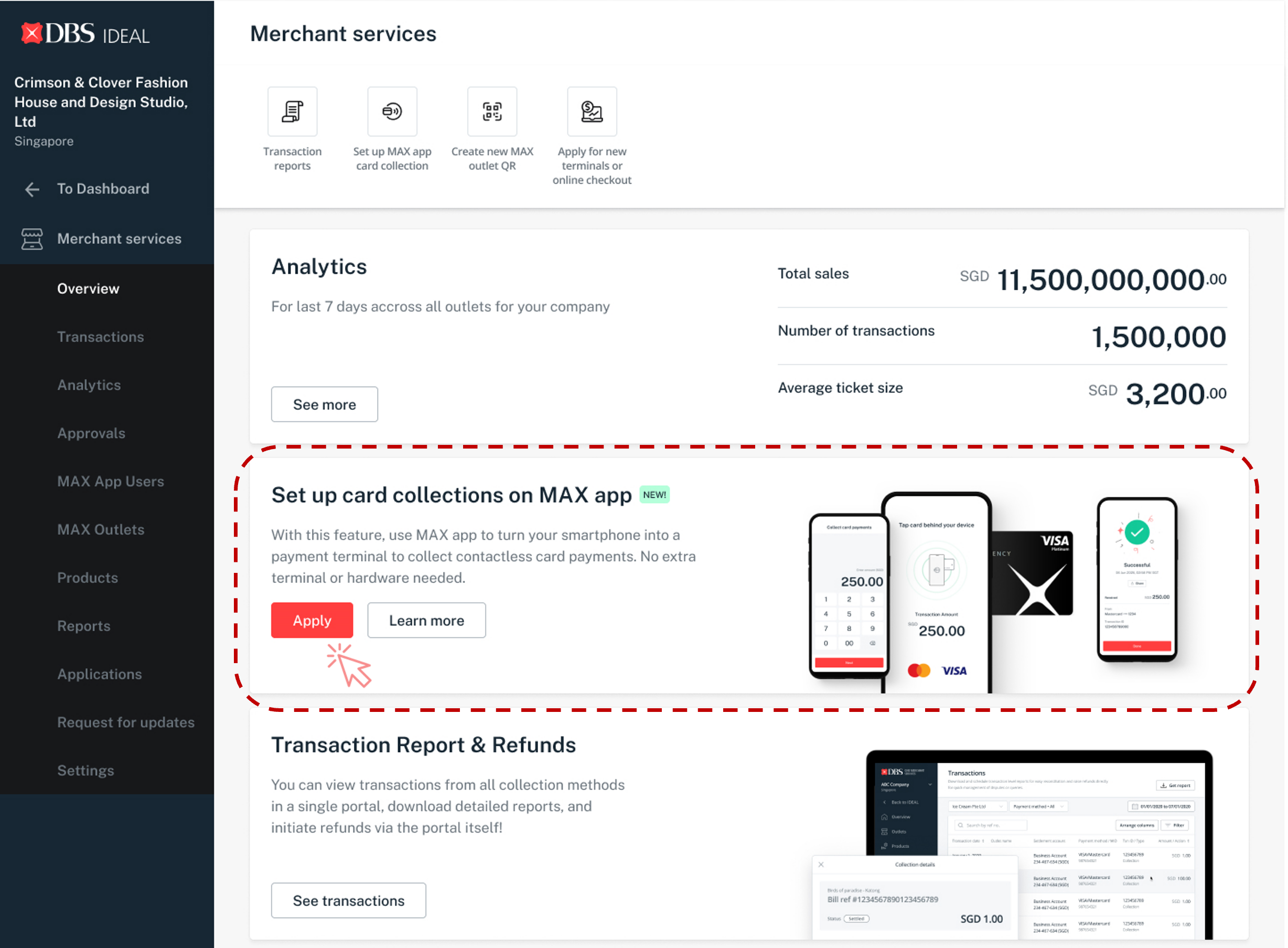 Log into DBS IDEAL to sign up for DBS MAX App via the Merchant Services tab. Get started with DBS MAX App in a few clicks, instantly!