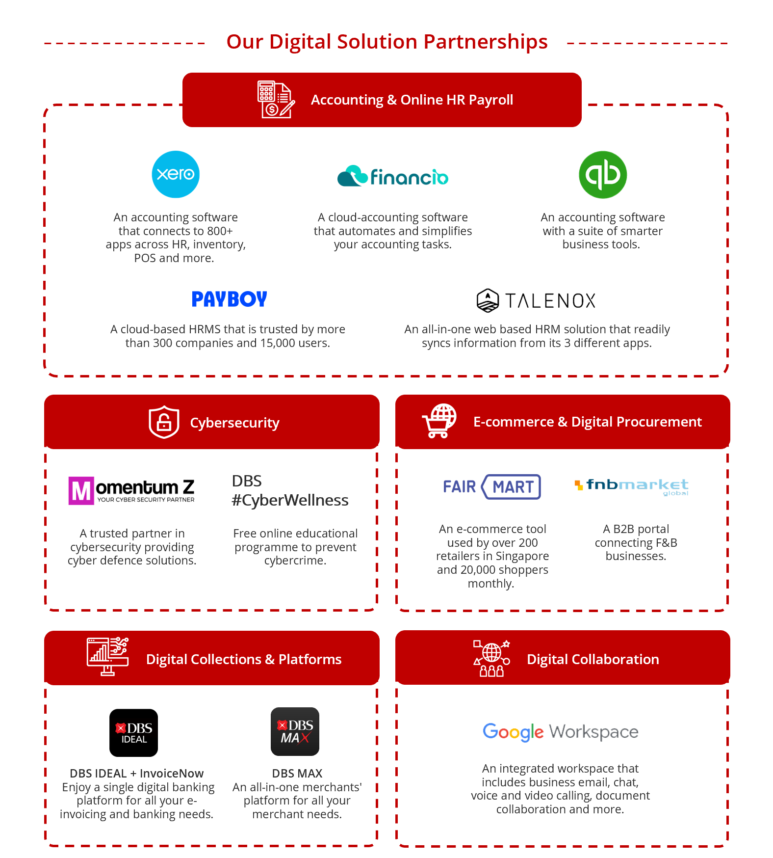 With our Start Digital Programme, enjoy up to 6 months free subscription for products ranging from account solutions, payroll and HR to setting up business communications infrastructure. Let us take your business further by digitalising key business operations right from the beginning. |